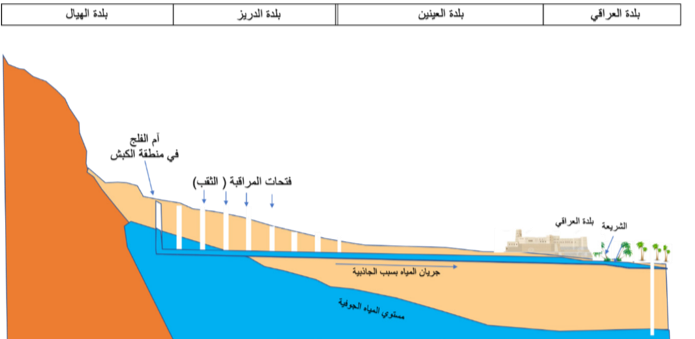 يخــرج فلــج العراقــي إلى ســطح الأرض في منطقــة شــريعة شــرق الحصــن، ثم يجــري خــلال البـلاد في أربــعة ســواقي رئيســية وهــي ســقي حابــس، ســقي ضاحــي الصــدر، ســقي ميــس وســقي سنيســل. كمــا تتميــز الضواحي الــتي تســقي مــن فلــج العينــين بانخفاضهــا عــن مســتوى الأرض بســبب عمــق الفلــج مقارنــة بفلــج العراقــي.