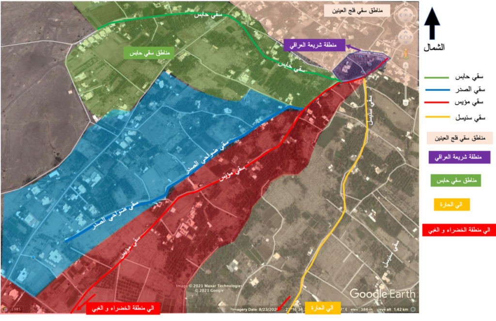 ببلدة العراقي يوجد 4 وكلاء لفلج العراقي لإدارة المياه والوقوف على شؤون الفلج ولكل وكيل 4 بادات.